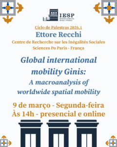 O Ciclo de Palestras IESP-UERJ promove a segunda edição de sua temporada 2026.1, recebendo o Prof. Ettore Recchi (CRIS-Sciences Po) para ministrar a conferência Global international mobility Ginis: a macroanalysis of worldwide spatial mobility na Sala Olavo Brasil.